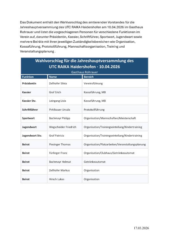 Wahlvorschlag des amtierenden Vorstandes